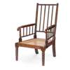 grain painted beech, the bobbin turned back above a deep loose cushion over a canework seat, raised on bobbin turned fore legs and outswept rear legs