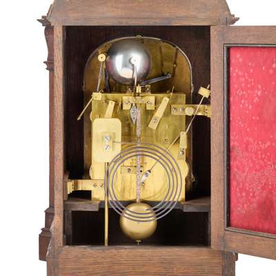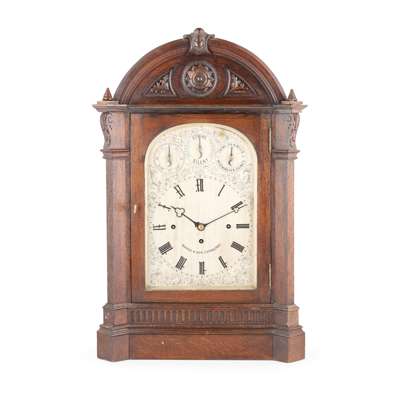 the signed silvered arch dial with Gothic Roman numerals, engraved foliate spandrels, the arch with subsidiary regulatory, ‘Strike/Silent’ and ‘Chime on Eight Bells/Westminster Chimes’ dials, the large arched case with carved pediment, the front flanked by carved acanthus corbel topped canted angles, the sides with pierced grills, on a plinth base, the triple train chain fusée movement, striking the full hour to a large coiled blued steel gong, chiming the quarters to a pin wheel activated nest of eight bells, the backplate also signed ‘Barrie, Edinburgh’