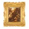 depicting a family group of a mother with six children standing at the door of a thatched cottage, alongside a stream, in a woodland setting, within a giltwood and gesso frame, unsigned, unmarked
