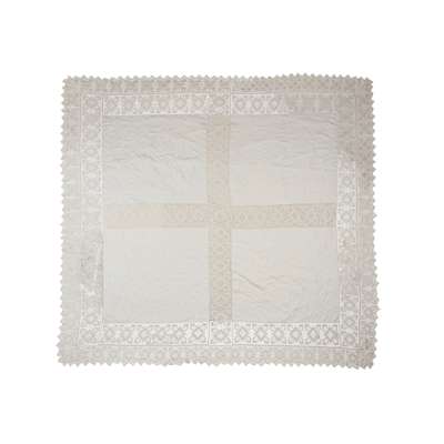 the bedcover with quarter panels worked mainly in satin stitch with some French knots depicting a flower-filled field, enclosed and divided by dentate crochet borders; the square pillow shams similarly finished (3)