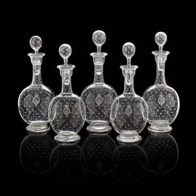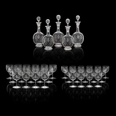 each engraved with a lion statant surmounting a dukes coronet, within a banner bearing the motto ‘HONI SOIT QUI MAL Y PENSE’, surmounted with a coronet, the body of each further engraved with stars; comprising: twenty two small wine glasses, 11.5cm high; twenty six sherry glasses, approximately 10.5cm high; and five decanters with stoppers; en suite with the preceding lot (qty)