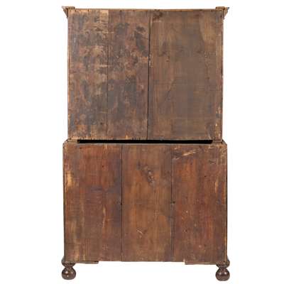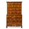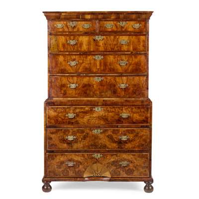 the moulded cornice above two short and three long graduated and featherbanded drawers; the lower part with a further three long drawers, the lower drawer centred with concave starburst marquetry, raised on bun feet