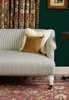 the low back and scrolled arms above a stuff-over seat, raised on white painted turned legs with brass castors; covered in blue ticking fabric