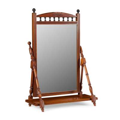 the rectangular mirror plates surmounted by a spindle gallery and laurel wreath carved pediment, and enclosed by reeded frames with knop finials, flanked by turned Y frame supports united by a shelf undertier with a moulded edge (2)