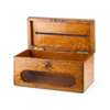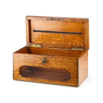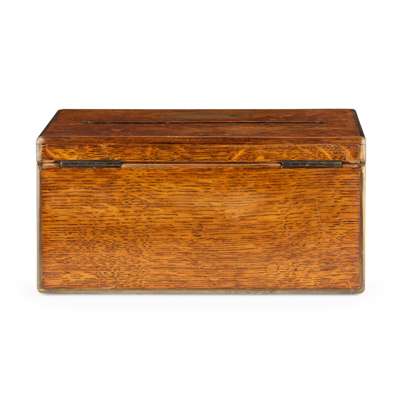 of rectangular form, the hinged top inset with a blank brass plaque, with a glazed front, the brass lock plate impressed W. THORNHILL 144 NEW BOND STREET