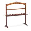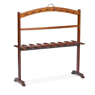 the arched top rail with a brass handle and turned pegs, above a shaped tier to hold eight pairs of boots, on trestle bases