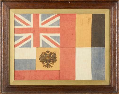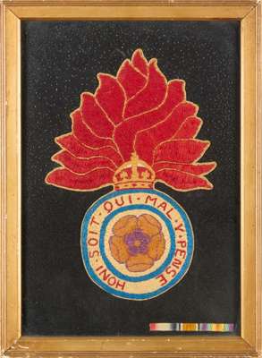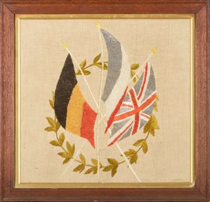 one embroidered with the crest for the Royal Fusiliers; one embroidered with a crest for the Royal Artillery; one embroidered with the British, French and Belgian flags; together with a CLOTH PRINTED WITH THE ALLIED FLAGS OF BRITAIN, BELGIUM, FRANCE AND RUSSIA, with an ink inscription to the reverse: ‘First British troops to enter the city of Lille, France, 17th Oct, 1918, R Bell’ (4)