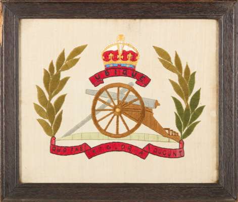 GROUP OF THREE FRAMED NEEDLEWORK PANELS OF MILITARY INTEREST