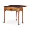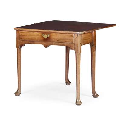 the rounded rectangular fold-over top opening on gateleg, above a long frieze drawer, raised on straight legs ending in pad feet