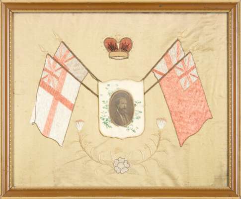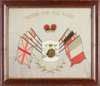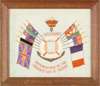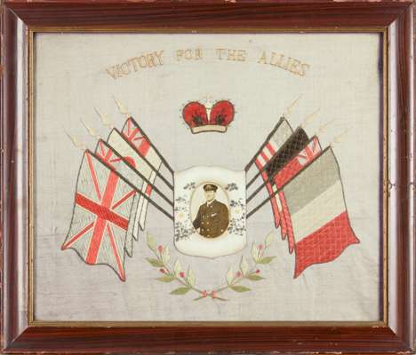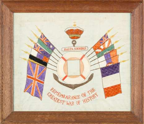 including naval examples; one inscribed ‘Victory for the Allies’ with a framed photo; one inscribed ‘United We Stand’ with a framed photo of three young sailors; one inscribed ‘Malta Souvenir’ ‘Remember the Greatest War of History’, centred with an empty photograph frame; and one embroidered with four flags, enclosing a photograph of a gentleman (4)
