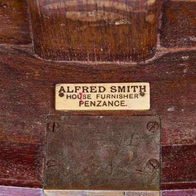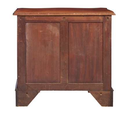 the serpentine top with a moulded edge above a brushing slide and four serpentine graduated drawers, flanked by canted angles with blind-fret carving, raised on shaped bracket feet; bearing an old ivorine trade label ALFRED SMITH/ HOUSE FURNISHER/ PENZANCE