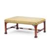 the rectangular padded seat raised on square legs with pierced brackets and ending in block feet, joined by a pierced H stretcher; in green and yellow striped upholstery