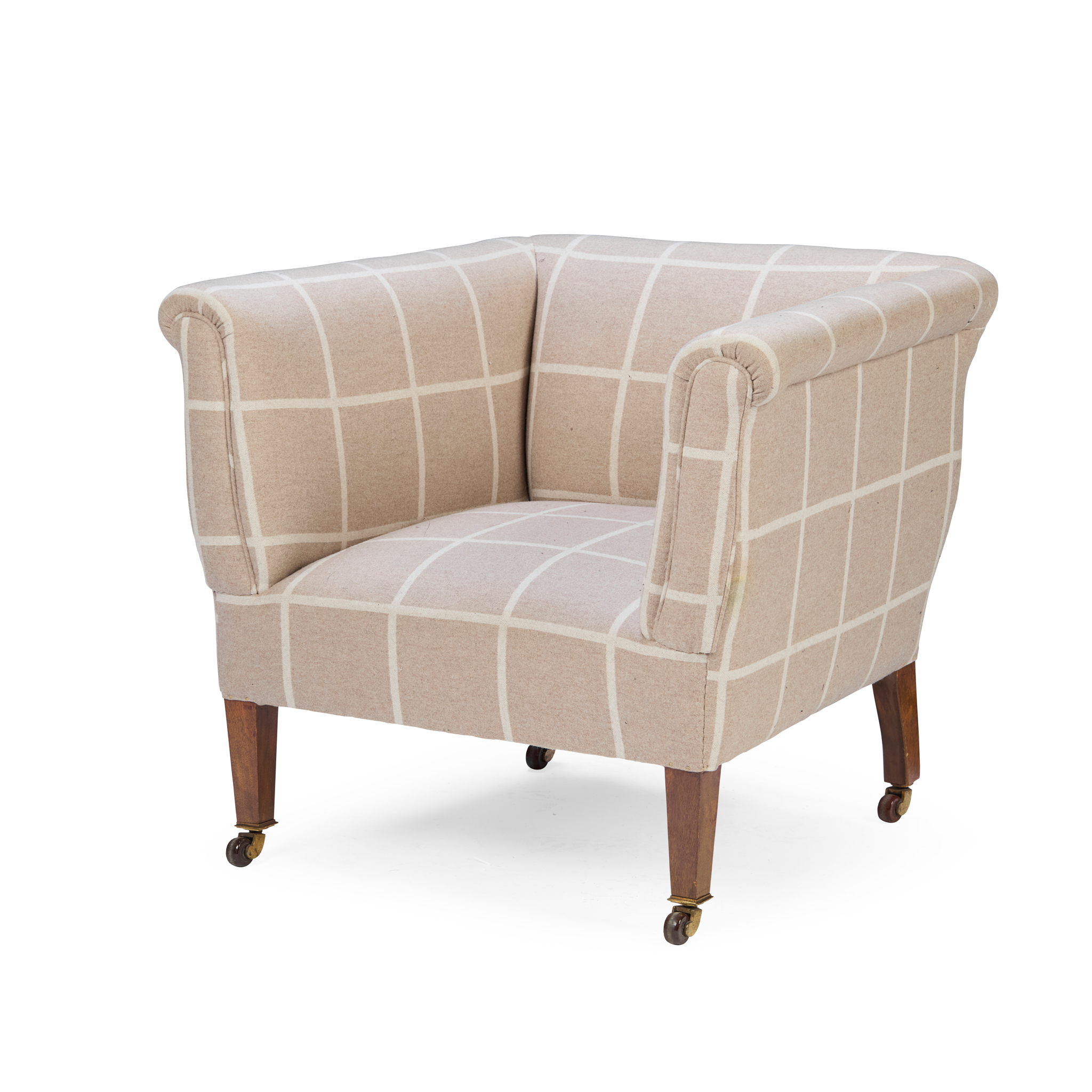 of squared form with high slightly scrolled arms, raised on square tapered legs with ceramic castors, covered in a taupe and cream wool windowpane upholstery