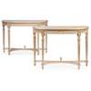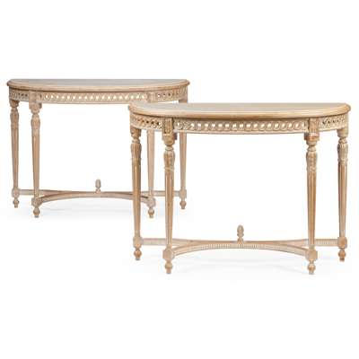the D-shaped cream coloured insert marble tops above pierced guilloche friezes, raised on acanthus carved and fluted tapered legs joined by concave X form stretchers (2)