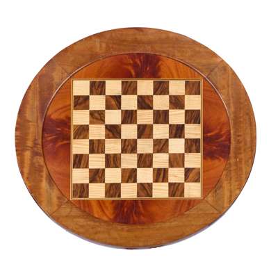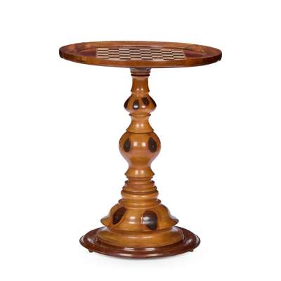 the circular top inlaid in various exotic hardwoods with a games board in a wide moulded border, raised on a turned baluster support and moulded circular base