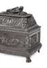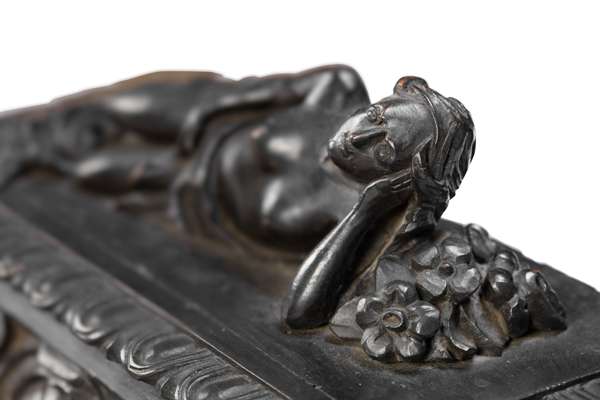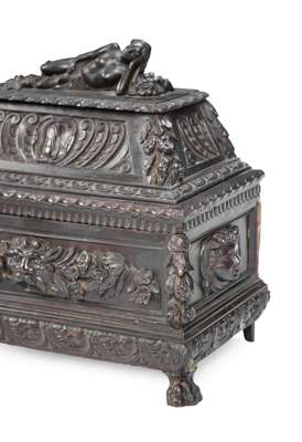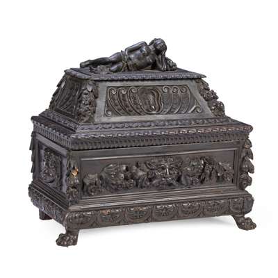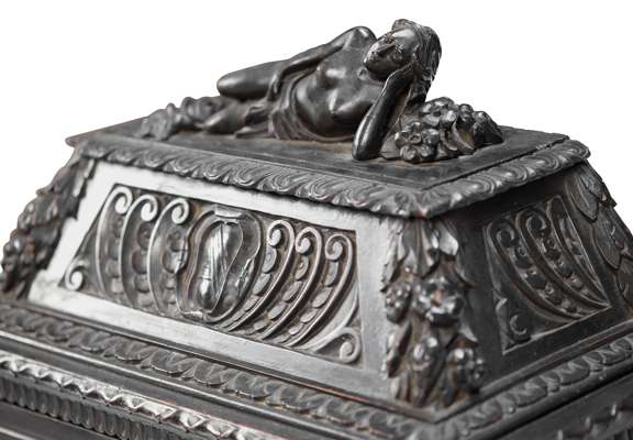in the Renaissance style, the hinged cover surmounted by the reclining figure of a sleeping woman, opening to a void interior, the sides carved with Green Man and putti masks, flower swags and fruit garlands, raised on carved paw feet