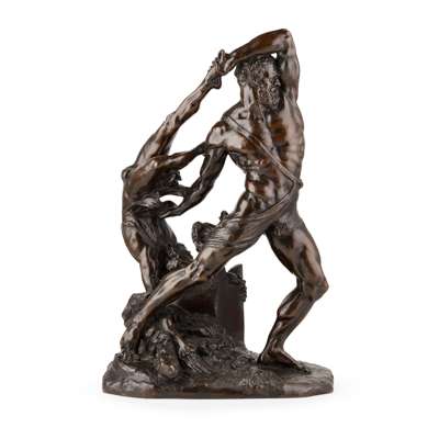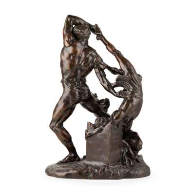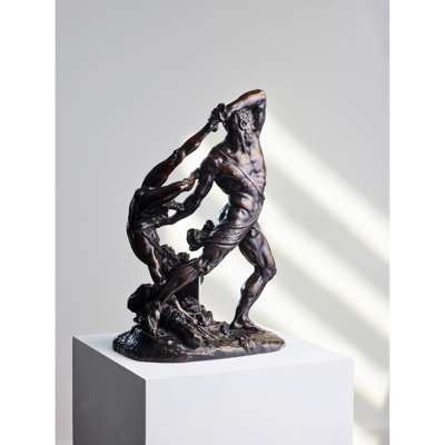 Due to his success, Canova received many commissions and no longer had to rely on funerary monuments for large-scale work, and could explore large freestanding classical figures, such as his ‘Hercules and Lichas’ from 1795- 1815, commissioned by Onorato Gaetani dell’Aquila d’Aragona. Often inspired by antiquity, Canova was known for reviving classical works in a way that avoided melodrama of antiquity and the artificiality of Neoclassicism. The tale of Hercules and Lichas is recounted in book IX of Ovid’s Metamorphoses: Hercules puts on a shirt poisoned with Nessus’ blood, and, driven mad by the pain, thinks that his servant Lichas is to blame. Lichas tried to explain his innocence, however Hercules threw him into the waves of the Euboic Sea. The original statue is now conserved in the National Gallery of Modern Art in Rome.