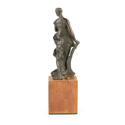 dark brown/green patina, the figure holding a bundle of flowers and a rudder or plough blade, on a wood plinth; possibly a bozzetto cast