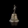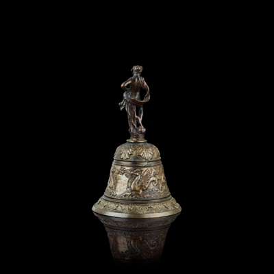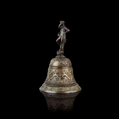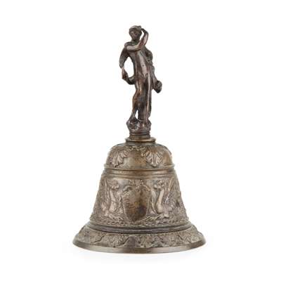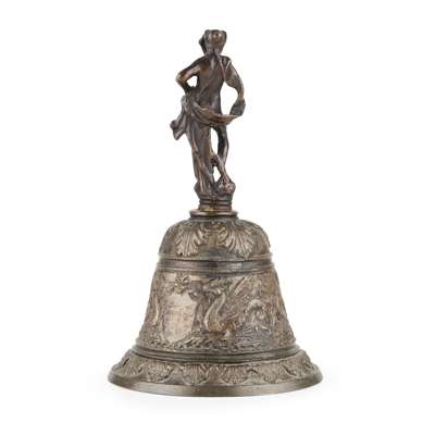 the handle with a figure of Mercury, dark brown patina; the associated bell cast with gryphons, caducei, and acanthus