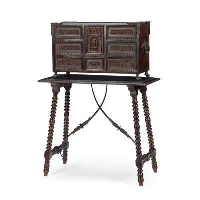 SPANISH BAROQUE STYLE EBONISED AND BRASS MOUNTED CABINET ON STAND Y