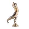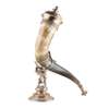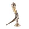 the horn of twisted form, supported within metal bands embossed with flower heads and with an oval cartouche surmounted with a winged putto; carried by a bearded figure on a naturalistic ground and raised on a domed circular foot; the horn aperture mounted with a flared metal collar and a domed cover with ball handle, the tip of the horn with a pierced metal mount and finial