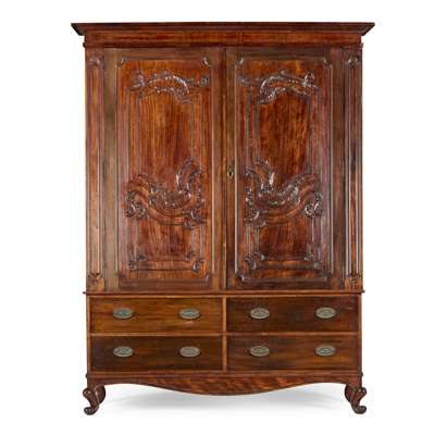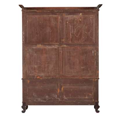 the moulded cornice above a pair of foliate moulded panel doors enclosing hanging space; the base with four short drawers raised on short cabriole legs