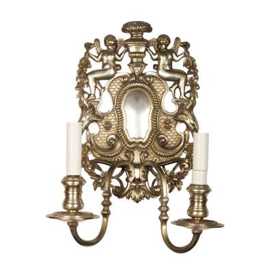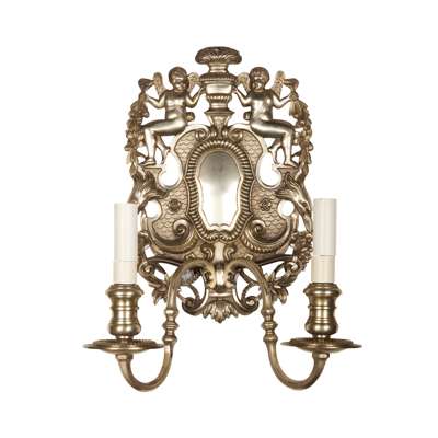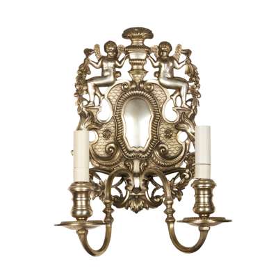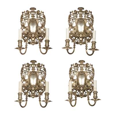 the cartouche-shaped pierced backplates surmounted by an urn flanked by putti holding garlands, each issuing twin scrolled candle arms, fitted for electricity (4)