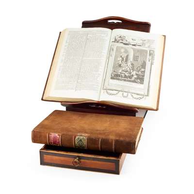 the hinged easel top with carrying handles and inlaid with a central fan medallion and leaf sprig, the initials "E G", and the date 1793; with a drawer below, containing the original 2 vol. Priestley's Bible published from 1791 onwards, one vol. inscribed “Eliz Gibbs/ Wood Street Cheapside/ His Bible 1793”