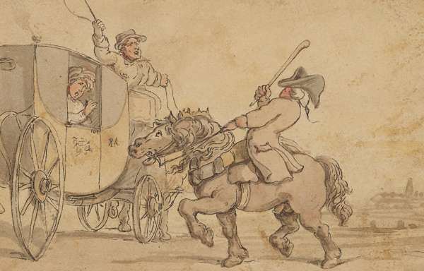 Signed, pen and ink and watercolour and two others by or in the manner of Rowlandson, ‘The hold-up’ and ‘The highwayman’ (3)