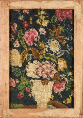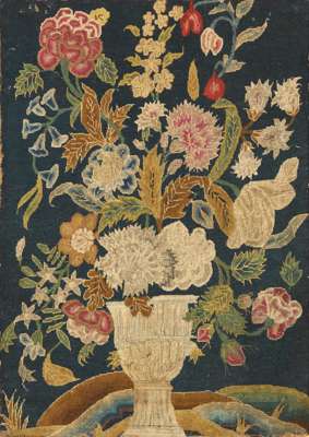 worked in linen and possibly cotton, depicting roses, tulips and other flowering branches in an urn within a landscape, mounted to a wooden stretcher, unframed