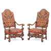 the tall arched backs above stuff-over seats flanked by foliate carved scrolling open arms, above foliate and scroll carved and pierced aprons and raised on acanthus carved cabriole legs joined by turned H-stretchers; covered in red and gold foliate and strapwork needlework (2)