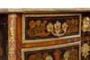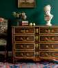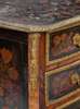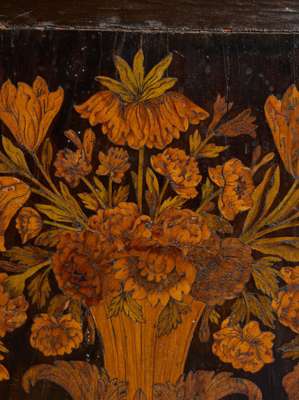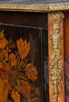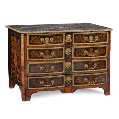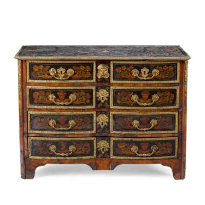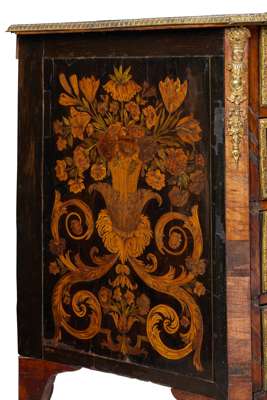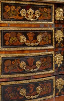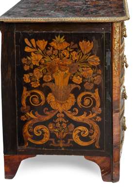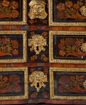 This exceptional commode, richly decorated with marquetry of flower-filled vases, scrolling rinceaux, and bearded grotesques, exemplifies the Louis XIV period’s interest in peinture en bois, the technique of creating painterly effects through marquetry. Elaborate floral marquetry of this type was produced in Paris after 1670, notably at the Gobelins, and popularized by André-Charles Boulle and Pierre Gole. A commode with almost identical marquetry panels to the top and sides is attributed to a contemporary of Boulle, Aubertin Gaudron (active circa 1670-1700), whose workshop was in the rue Saint-Honoré. In his capacity as the supplier to the Garde Meuble between 1686 and 1713 Gaudron provided numerous pieces in wood marquetry for the court, with clients including the Prince de Condé, the duc de Chartres, and the duc d'Anjou. In 1715 Gaudron delivered a similarly decorated marquetry commode to the château de Compiègne. That piece was described as: