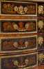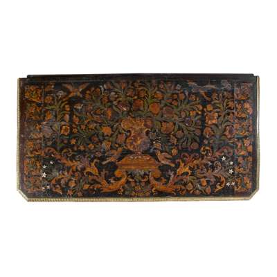 “…de bois de plusieurs couleurs fond d’ébène ornée milieu d’un vase rempli de fleurs posé sur un bout de table et un masque grotesque au dessous le reste rempli de rinceaux fleurs oiseaux et papillons au naturel…”