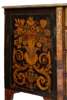 The description closely aligns with the iconography and decorative vocabulary seen on the marquetry top of the present commode.