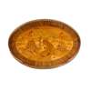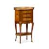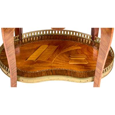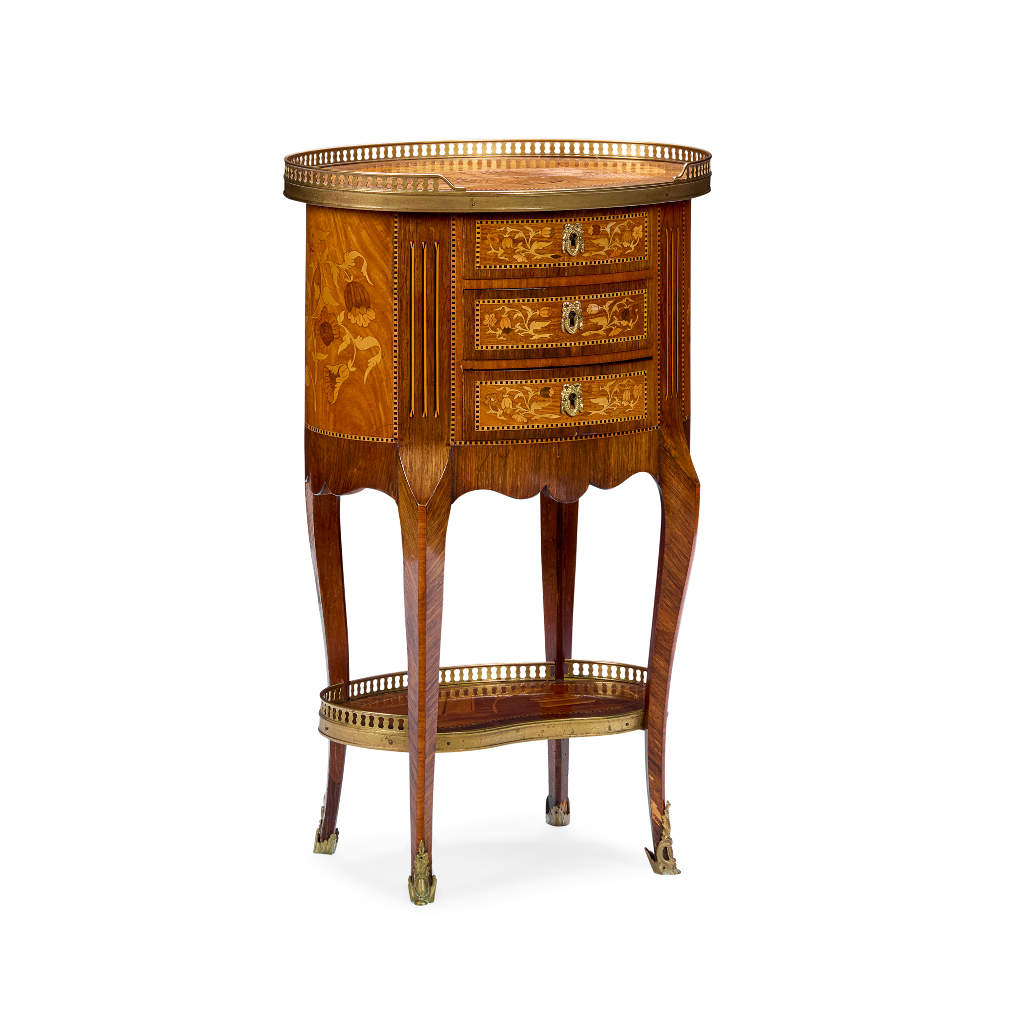 the oval crossbanded top with a pierced brass gallery and inlaid with Chinoiserie marquetry, above three short drawers, the sides with further floral marquetry, raised on cabriole legs ending in sabots joined by a reniform undertier with a brass gallery and inlaid with trompe l'oeil paper and quill