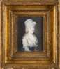 watercolour and body colour on ivory, painted en grisaille, the sitter wearing a loosely tied turban with lace trim above a chemise and flounce collar and wide blue satin waistband, against a dark grey ground, in a deep moulded gilt frame