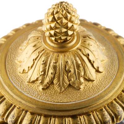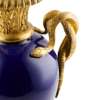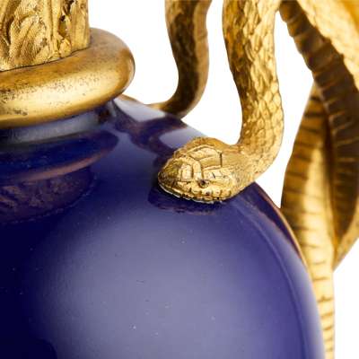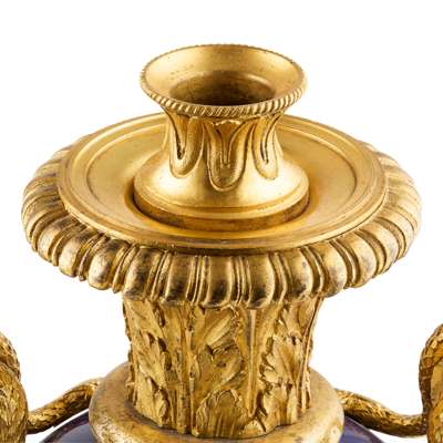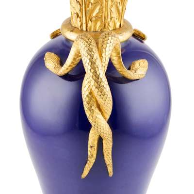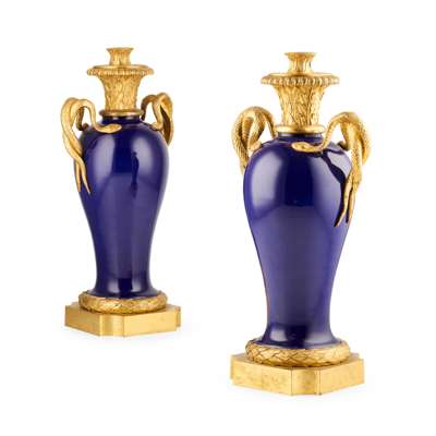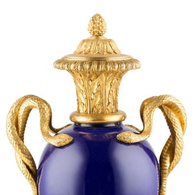 each with a reversable cover set with a pinecone finial and a bobèche candlestick fitting to the reverse, flanked by entwined serpent handles, the baluster meiping form vases on laurel leaf-cast plinth bases (2)