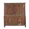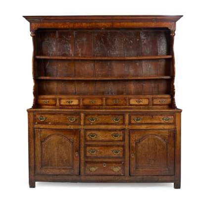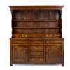 the moulded cornice with pendant finials above an enclosed back with two shelves and six short drawers, the base with four central drawers flanked by short drawers and arch panel cupboard doors, raised on stile feet