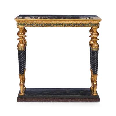 the Nero Portoro marble insert top above a gilt frieze with foliate patinated mounts, raised on spiral carved ebonised and gilt legs on an ebonised plinth base; the associated mirror with a moulded cornice above a frieze with ebonised gesso moulded nymphs and urn flanked by moulded volutes, over a tall mirror plate enclosed by moulded laurel garlands