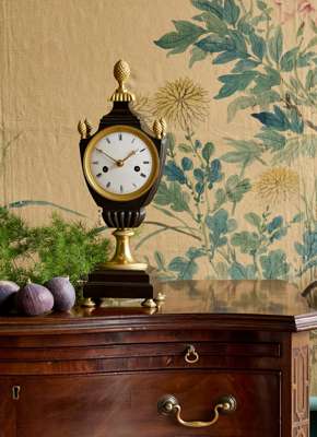 the white enamel dial with Roman numerals, the tapering square urn case surmounted by five pinecone finials, on a gilt socle and square stepped plinth base with gilt turned feet, the twin train movement with silk suspension and outside countwheel striking on a bell