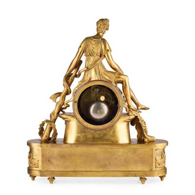 the white enamel dial with Roman numerals, signed ‘H. Laresche á Paris’, the case surmounted by the mythological figure of the Lydian Queen Omphale, sitting astride on a drum draped with the Nemean Lion's fleece at her feet on one side, on the other she holds Hercules' club, supported on a rounded rectangular gilt bronze base set with Neoclassical frieze and roundels, the centre frieze depicts the male female role reversal central to the mythological story, with Hercules holding a spindle and Omphale sitting on the fleece and holding the club Hercules used to kill the lion, set on six toupie feet, the twin train movement with outside countwheel striking on a bell