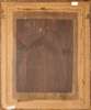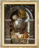 reverse oil on glass depicting an urn with flowers and fruit in an architectural niche