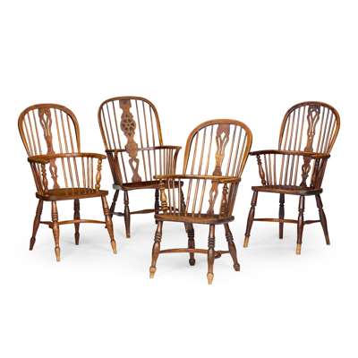 MATCHED SET OF FOUR ELM AND YEW WINDSOR ARMCHAIRS