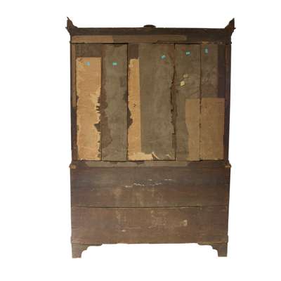 the pierced fretwork and dentil moulded cornice above a pair of moulded panel doors with carved ribbon-tied laurel wreaths, flanked by brass capped columns, opening to a void interior; the base with three long drawers raised on tapered square feet