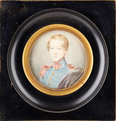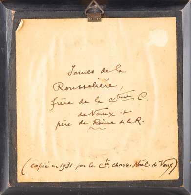 watercolour on card or vellum, circular, in a gilt metal bezel and black moulded frame, inscribed on the reverse ‘James de la Rousselière, frére del la Ctesse C de Vaux et pére de Reine de la R. (copie en 1931 ** le Cte Charles Noël de Vaux)'