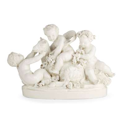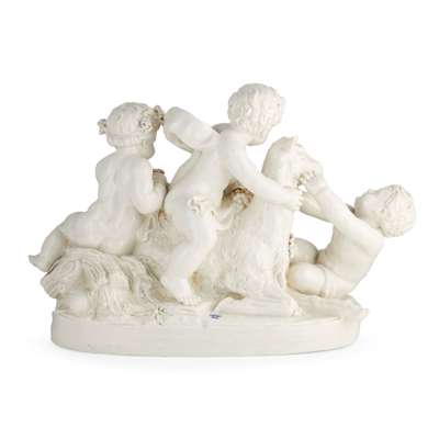 modelled as a putto seated upon a goat, with two further putto at play alongside, with garlands of fruiting vines, on a naturalistic ground, raised on an oval base, underglaze blue factory mark to the reverse and inscribed signature, marked ‘KAZA’ in underglaze blue to the base