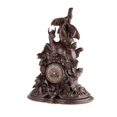 CARVED BLACK FOREST MANTEL CLOCK, LEUENBERGER & SON