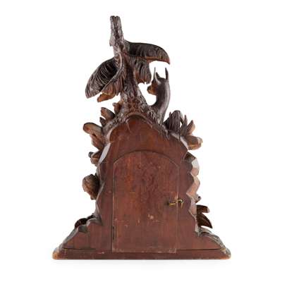 the wooden dial inlaid with brass Roman numerals, surrounded with grasses, branches and foliage, surmounted with a chamois seated under a pine tree, raised on a shaped moulded base, the eight day striking movement stamped LEUENBERGER INTERLAKEN 556