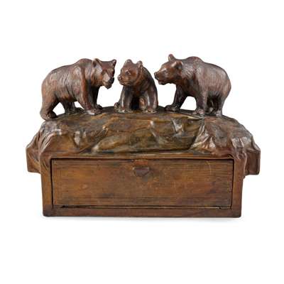 of carved wood covered in brown hide, the top with three bears on a rocky outcrop, above a single drawer to the base