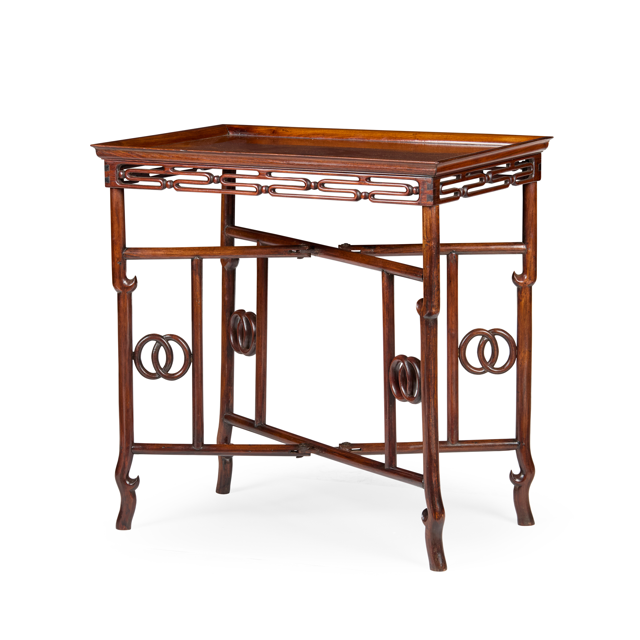 the lift-off tray top with a moulded edge above a pierced frieze, on a folding X frame stand with scroll legs and double ring symbols